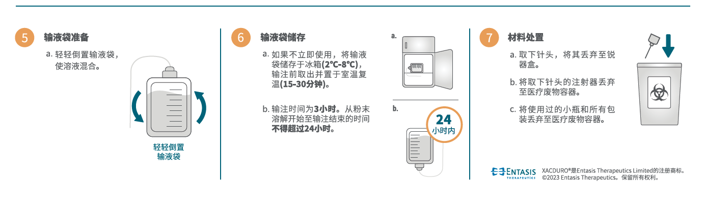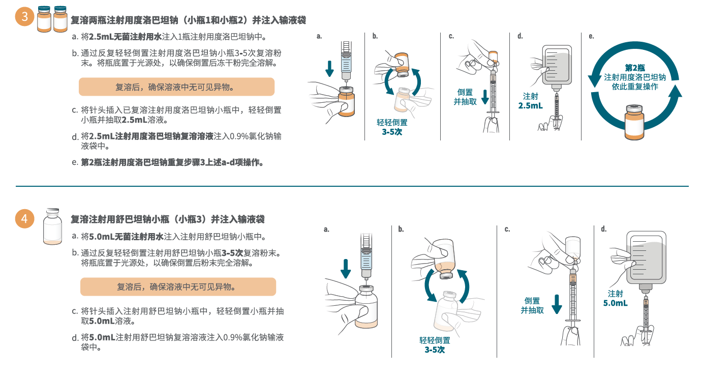 - 为制备本品所需剂量,分别抽取5.0 mL舒巴坦复溶后溶液和5.0 mL(每小瓶 2.5 mL,共2瓶)度洛巴坦复溶后溶液,向100 mL 0.9% 氯化钠注射液输液袋中注入所抽取体积的舒巴坦和度洛巴坦。本品未用完药液应丢弃。