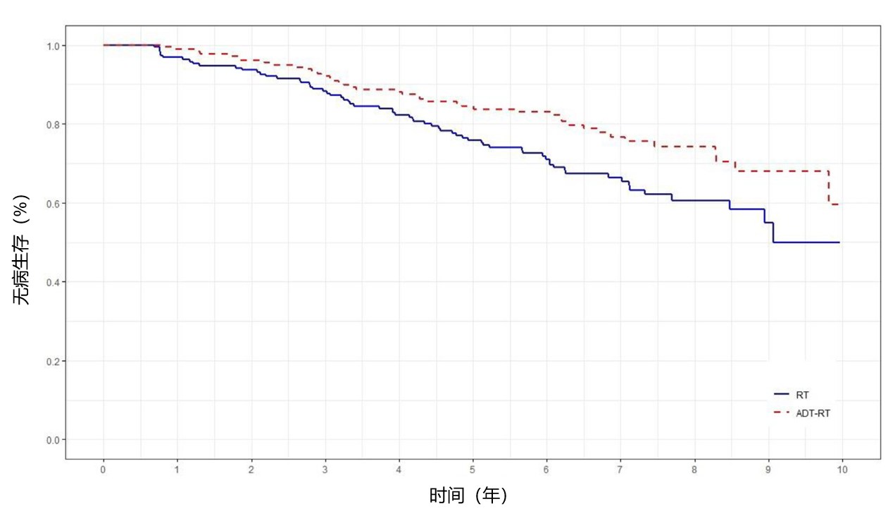 方法:GETUG 14研究将376例患者随机分配至放疗组(n=191)或短期雄激素剥夺治疗联合放疗组(n=179)。两组的放疗剂量均为80 Gy。短期雄激素剥夺治疗方案为每月使用曲普瑞林,每日使用氟他胺,总疗程为4个月,于放疗前2个月开始。研究主要终点为无病生存期(DFS),次要终点包括总生存期(OS)、生化失败(BF)、转移失败(MF)、毒性反应及生活质量。