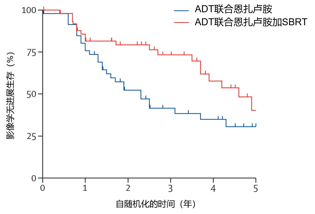 结果:2016年10月18日至2023年7月31日期间,共102例男性患者被随机分配至ADT联合恩扎卢胺组(n=49)或ADT联合恩扎卢胺加SBRT组(n=53);每组各排除1例因早期退出和数据不足的患者后,最终纳入分析的ADT联合恩扎卢胺组有48例患者,ADT联合恩扎卢胺加SBRT组有52例患者。 大多数患者为白人(80例,80%),中位年龄为73.0岁(四分位距67.0~79.5)。中位随访时间为4.8年(四分位距3.4~5.0),如图2,与单纯ADT联合恩扎卢胺相比,ADT联合恩扎卢胺加SBRT显著改善了影像学无进展生存期(中位影像学无进展生存期:4.6年,95% CI:3.7~未达到 vs 2.3年,95% CI:1.4~3.7;HR=0.48,95% CI:0.27~0.86;p=0.014)。 最常见的3级治疗相关不良事件为勃起功能障碍(ADT联合恩扎卢胺组14例患者中有8例[57%],ADT联合恩扎卢胺加SBRT组12例患者中有9例[75%])。未发生4级毒性反应,也无治疗相关死亡病例。