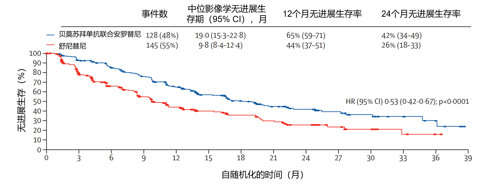 结果:2020年8月25日至2023年2月6日期间,共评估了687例患者的入组资格,其中531例(77%)被随机分配至贝莫苏拜单抗联合安罗替尼组(266例,50%)或舒尼替尼组(265例,50%)。527例(99%)患者被纳入全分析集,其中贝莫苏拜单抗联合安罗替尼组263例(50%),舒尼替尼组264例(50%)。所有患者均为中国人(男性400例,76%;女性127例,24%),中位年龄为60岁(四分位距54~67)。 截至数据截止日期(2024年1月31日),中位随访时间为22.8个月(四分位距15.2~29.7)。如图4,在全分析集中,贝莫苏拜单抗联合安罗替尼组的中位无进展生存期显著长于舒尼替尼组(19.0个月,95% CI:15.3~22.8 vs 9.8 个月,95% CI:8.4~12.4;HR=0.53,95% CI:0.42~0.67;p<0.0001)。在符合方案集中,贝莫苏拜单抗联合安罗替尼组中位无进展生存期为19.0个月(95% CI:16.5~22.8),舒尼替尼组为11.0个月(95% CI:8.5~13.6)(HR=0.55,95% CI:0.43~0.70;p<0.0001)。 最常见的3级及以上治疗相关不良事件为高血压(贝莫苏拜单抗联合安罗替尼组264例患者中91例[34%],舒尼替尼组264例患者中55例[21%])。贝莫苏拜单抗联合安罗替尼组有63例(24%)患者发生严重治疗相关不良事件,舒尼替尼组有42例(16%)。贝莫苏拜单抗联合安罗替尼组有3例(1%)患者因治疗相关不良事件死亡(分别为心搏呼吸骤停、原因不明及肾衰竭各1例),舒尼替尼组无死亡病例。