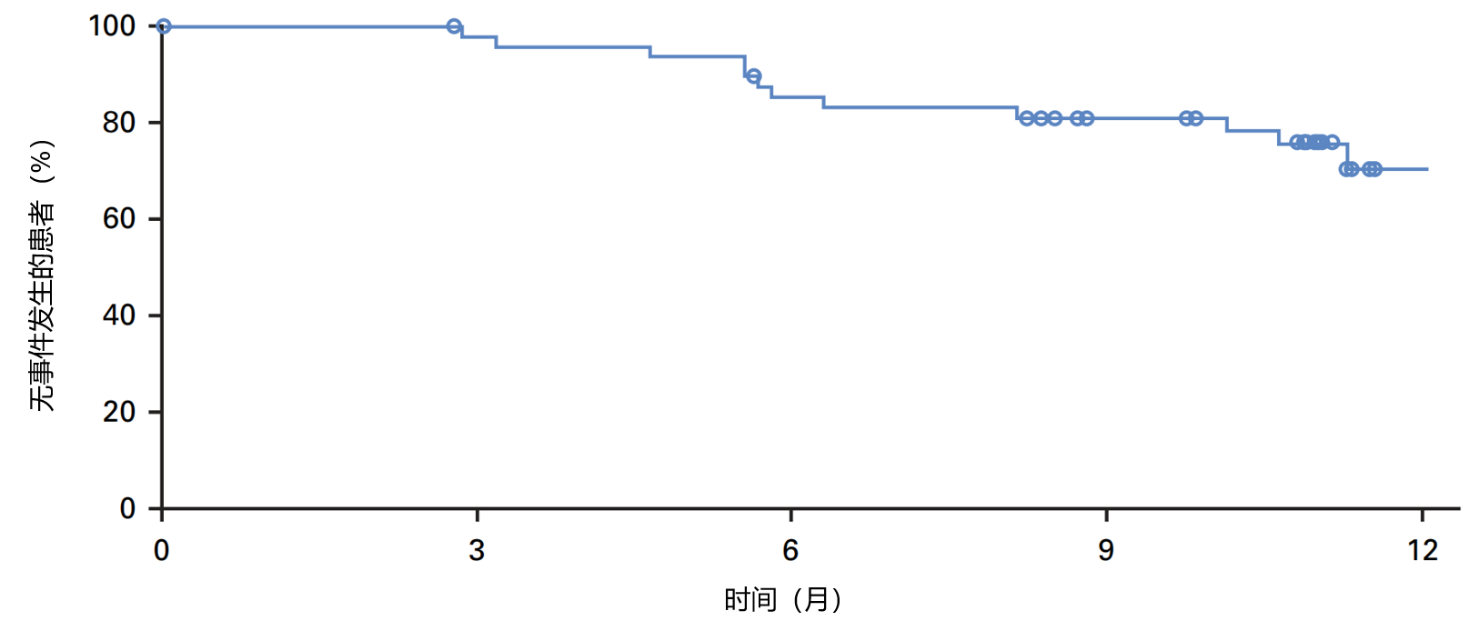 结果:截至数据截止日期(2025年3月31日),队列1~4分别治疗了53例、85例、28例和52例患者。队列2的总完全缓解率和中位缓解持续时间分别为82.4%(95% CI:72.6~89.8)和25.8个月(95% CI:8.3~无法评估);如图7,队列4的6个月、9个月和12个月无病生存率分别为85.3%(95% CI:71.6~92.7)、81.1%(95% CI:66.7~89.7)和70.2%(95% CI:51.6~82.8);队列1和队列3的总完全缓解率分别为67.9%(95% CI:53.7~80.1)和46.4%(95% CI:27.5~66.1)。 队列2、队列4、队列1和队列3的3级及以上治疗相关不良事件发生率分别为12.9%、13.5%、37.7%和7.1%;严重治疗相关不良事件发生率分别为5.9%、5.8%、15.1%和3.6%。未发生治疗相关死亡病例。