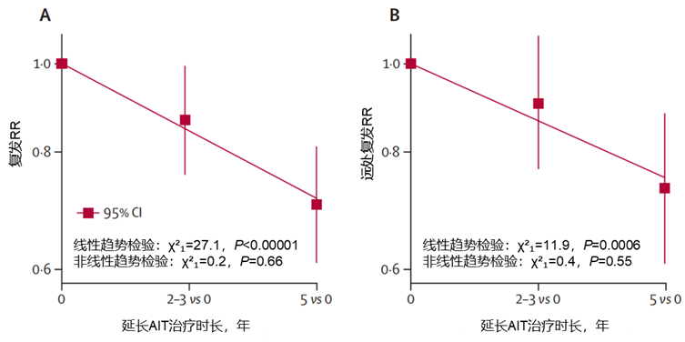 既往已接受AIT治疗亚组(中位随访8.1年):将患者分配至延长5年AIT治疗相较于延长2-3年AIT治疗,显示出更显著且更明确的疗效,延长AIT治疗时长与复发风险降低呈高度显著且近似线性的正相关关系(0年、2.5年与5年治疗的线性趋势检验:χ²₁=27.1,P<0.00001;非线性趋势检验:χ²₁=0.2,P=0.66,图1)。