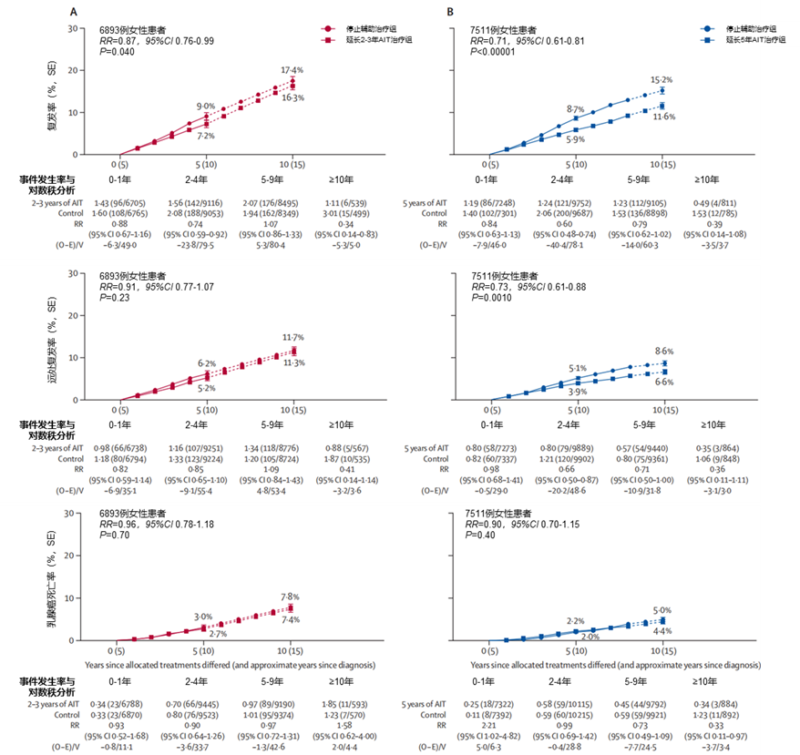 既往仅接受他莫昔芬治疗亚组:将患者分配至延长AIT治疗组后,0-4年内的复发风险显著降低44%(RR=0.56,95%CI 0.46-0.67,P<0.0001),但由于两项最大规模试验早期出现广泛交叉治疗,导致后续随访数据不足,无法评估长期疗效。