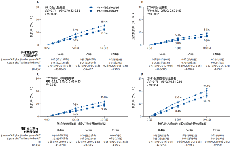 汇总所有试验数据后,延长AIT治疗组较停止辅助治疗组的复发率显著降低27%(RR=0.73,95%CI 0.67-0.80,P<0.0001)。