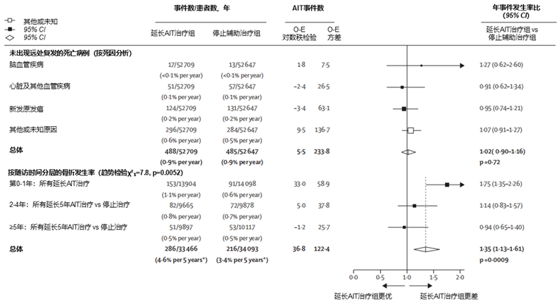 图4. 针对既往接受AIT治疗的患者,继续延长2-3年 vs 停止辅助治疗或延长5年AIT治疗 vs 停止辅助治疗对非乳腺癌死亡率及骨折发生率的影响