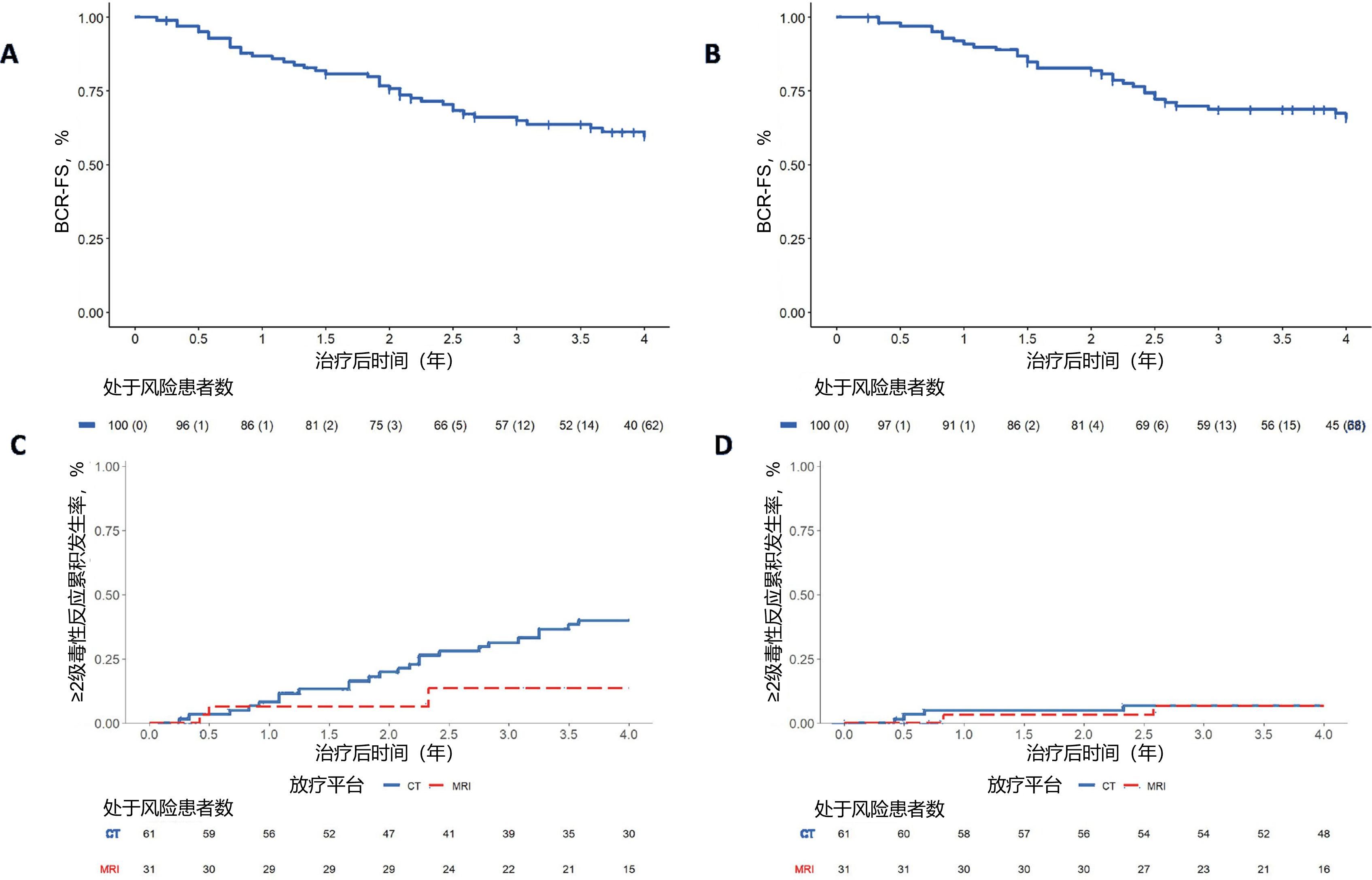 研究对全队列(n=100)的毒性反应进行了评估。≥2级胃肠道(GI)与泌尿生殖系统(GU)晚期毒性累积发生率分别为6.6%和32%(图1C、D)。计算机断层扫描(CT)引导放疗组的4年GU毒性累积发生率显著高于磁共振(MRI)引导放疗组(40% vs 14%;sHR=3.54,95% CI:1.19-10.55;P=0.023);而不同引导平台的GI毒性发生率无显著差异。