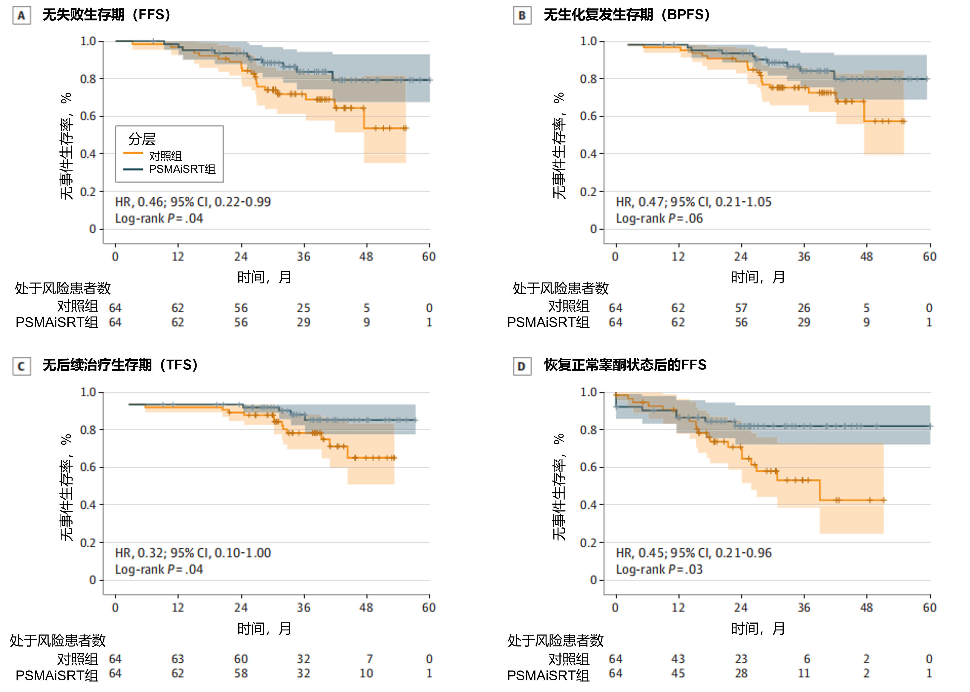 结果:中位随访时间37个月(范围7-60个月)时,PSMAiSRT组较对照组显著改善FFS(84% vs 69%,风险比[HR]=0.46;95% CI:0.22-0.99;P=0.04)。两组在远处转移和总生存期方面均无显著差异。两组间BPFS的差异未达到常规统计学显著性水平(HR=0.47;95% CI:0.21-1.05;P=0.06)。PSMAiSRT组较对照组显著改善TFS(HR=0.32;95% CI:0.10-1.00;P=0.04)。研究中67%的患者恢复至正常睾酮水平(≥5.2 ng/dL)。从达到正常睾酮水平至治疗失败的中位时间(范围)为22.3(0-90)个月。PSMAiSRT组恢复正常睾酮状态后的FFS显著延长(HR=0.45;95% CI:0.21-0.96;P=0.03)。图2展示了FFS、BPFS、TFS及恢复正常睾酮状态后的FFS的KM曲线。不良事件方面,在6个月时或中位随访时,≥2 级和≥3 级事件的无事件生存率(EFS)在两组间均无显著性差异。