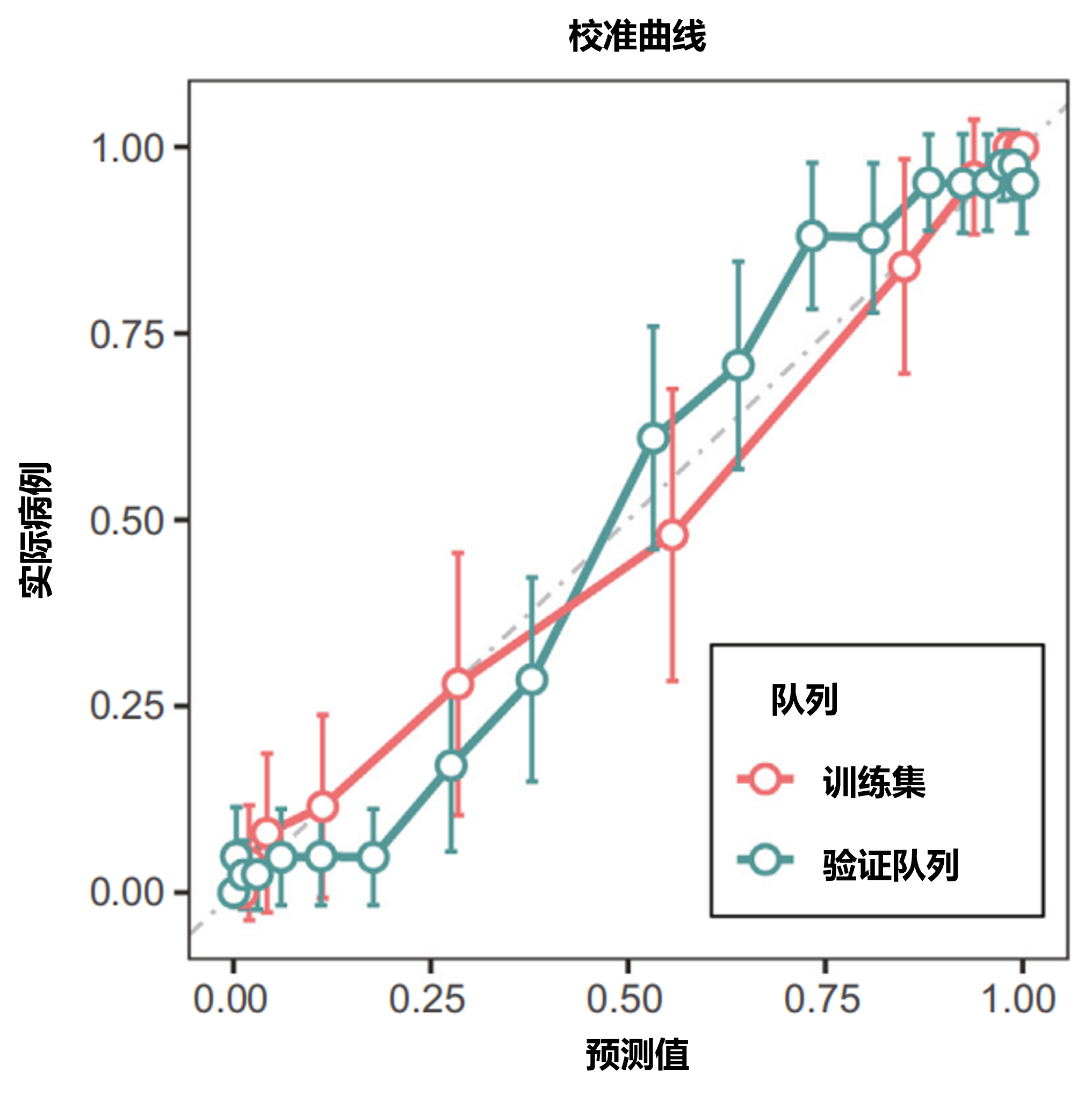 图4.训练集与验证队列中,基于RCAID评分预测的RCC检出情况与实际病例的校准曲线