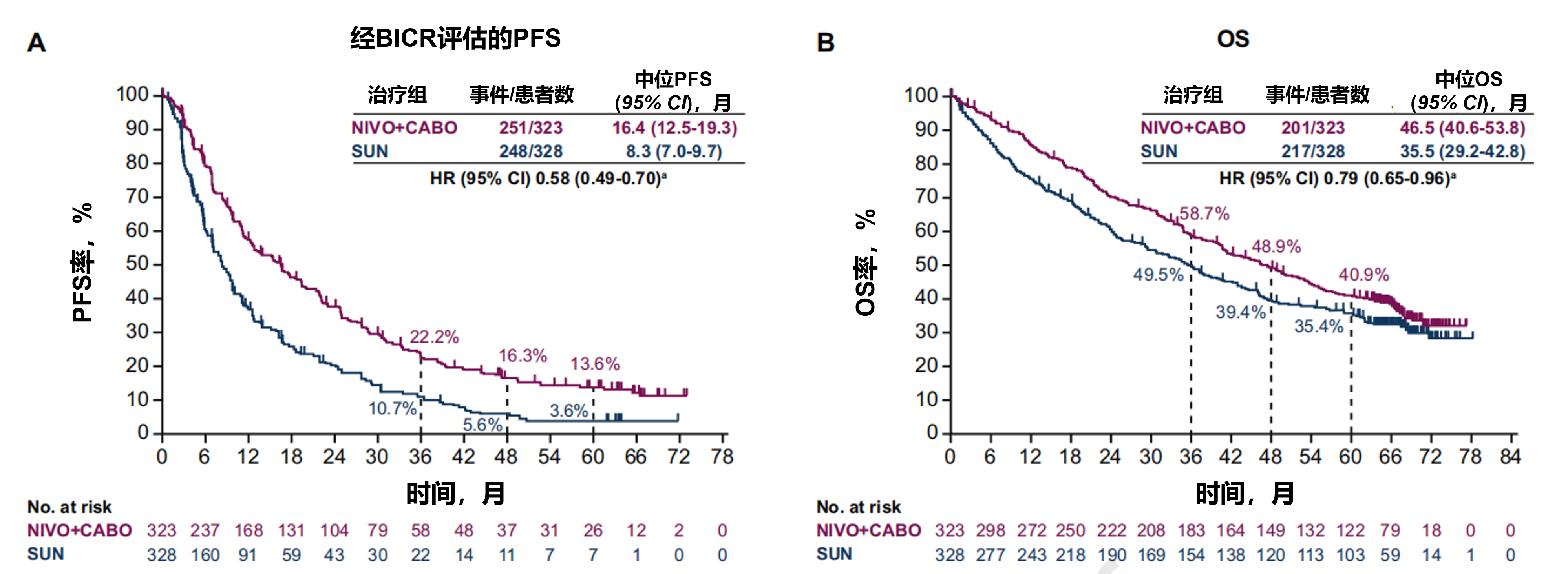 结果:在2017年9月11日至2019年5月14日期间,共323例患者被随机分配至NIVO+CABO组,328例患者分配至SUN组。两组最终各有320例患者接受研究治疗方案。在所有接受治疗的患者中(NIVO+CABO组320例;SUN组320例),NIVO+CABO组仍有21例(6.6%)患者持续接受治疗,SUN组为15例(4.7%)。