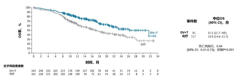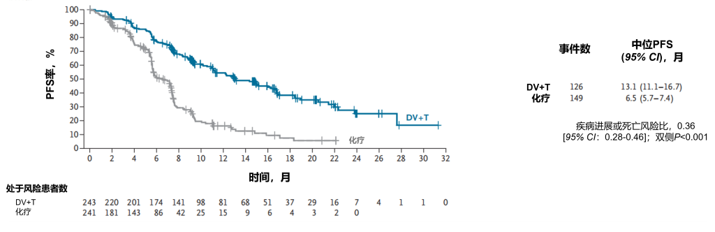 安全性分析:根据研究者评估,在维迪西妥单抗+特瑞普利单抗组中,243例接受过至少一次试验治疗的患者中有240例(98.8%)出现任意级别的治疗相关不良事件;化疗组中,222例接受过至少一次试验治疗的患者全部(100%)出现任意级别的治疗相关不良事件。治疗相关不良事件导致治疗中止的发生率分别为:维迪西妥单抗联合特瑞普利单抗组12.3%,化疗组10.4%。