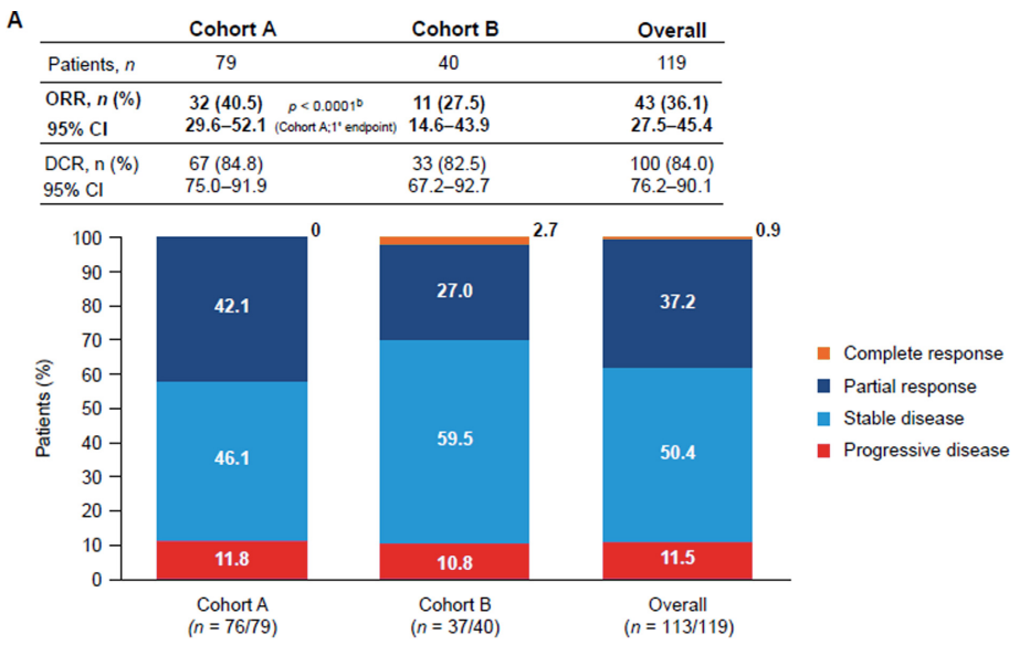 主要结果:中位随访时间为19.3个月:队列A为19.3(11.2–26.5)个月;队列B为20.4(10.3–24.3)个月。所有患者均纳入研究者报告结局的疗效分析集。有8例患者(队列A:n=6;队列B:n=2)缺乏靶病灶的基线中心评估数据,因此119例患者(队列A:n=79;队列B:n=40)构成独立中心评审(ICR)报告结局的疗效分析集。