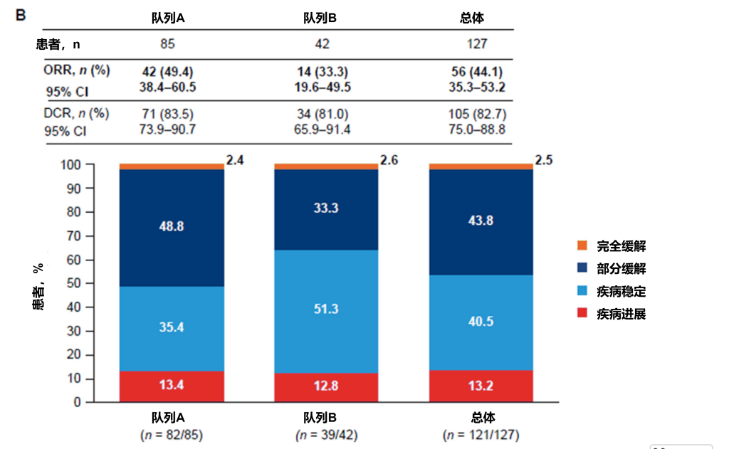 客观缓解率(ORR)在队列A(主要终点)为40.5%(95% CI:29.6–52.1%;32/79),队列B为27.5%(95% CI:14.6–43.9%;11/40),总体为36.1%(95% CI:27.5–45.4%;43/119)(图2A)。主要终点与10%的预设阈值相比具有统计学显著性(P < 0.0001)。两个队列及总体的疾病控制率均超过80%(图2A)。在队列A和队列B中,部分缓解分别为32/76例(42.1%)和10/37例(27.0%),完全缓解分别为0/76例(0%)和1/37例(2.7%)。为保守起见,在ORR分析中将数据缺失患者(每队列各3例)视为无缓解者(疾病进展患者),但其最佳总体缓解数据未在图中展示(图2A和B)。研究者评估的ORR(次要终点)在队列A为49.4%(95% CI:38.4–60.5%),队列B为33.3%(95% CI:19.6–49.5%)(图2B)。