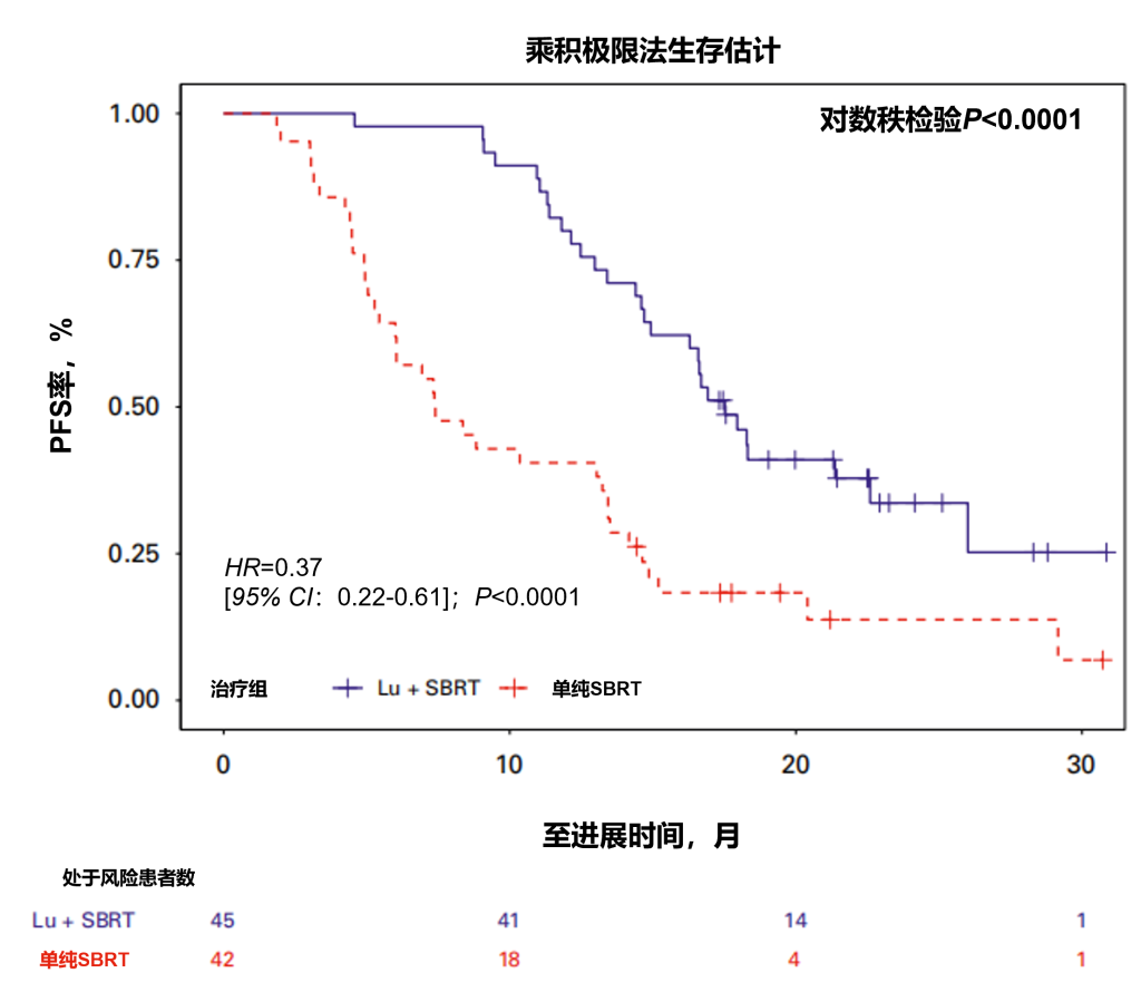 结论:综上所述,与单纯SBRT相比,联合使用177Lu-PNT2002与SBRT可显著延长寡复发激素敏感性前列腺癌患者的无进展生存期,且未伴随毒性增加。