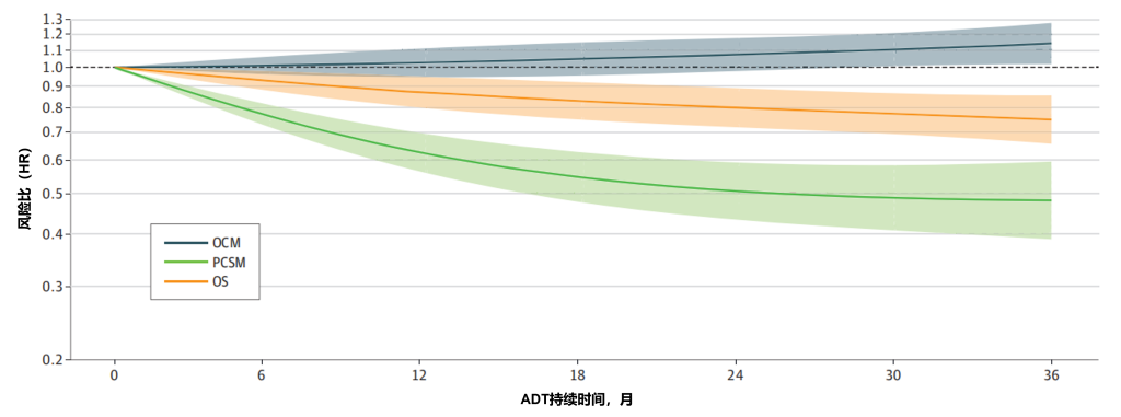 图4. 以平滑样条模型分析:总生存期(OS)、前列腺癌特异性死亡率(PCSM)及其他原因死亡率(OCM)作为雄激素剥夺疗法(ADT)持续时间连续变量的函数关系
