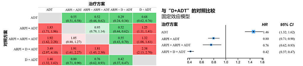 主要结果:按不同治疗类别分析时,ARPI + D + ADT联合方案相比ARPI + ADT(HR=0.81;95% CI:0.68–0.96)、D + ADT(HR=0.73;95% CI:0.64–0.82)以及单纯ADT(HR=0.56;95% CI:0.48–0.66)均显示出总生存期改善。而ARPI + ARPI + ADT联合方案仅在与单纯ADT比较时表现出具有统计学显著性的总生存期改善(HR=0.65;95% CI:0.55–0.77)。ARPI + D + ADT与ARPI + ARPI + ADT之间、ARPI + ADT与D + ADT之间均未观察到统计学显著差异(图5)。按具体治疗方案分析时,总生存期的结果模式与治疗类别分析一致,无进展生存期也观察到类似结果。