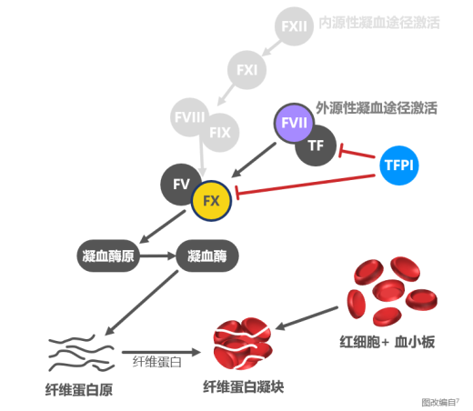 TFPI 是组织因子(TF)–FVIIa复合物的主要抑制物,此复合物可激活 FX 生成 FXa4,5