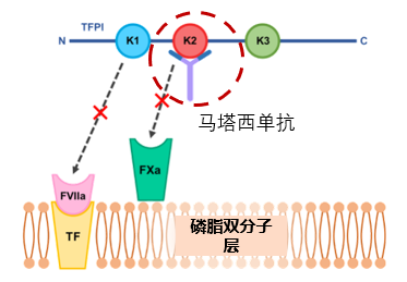 马塔西单抗通过靶向组织因子途径抑制物 (TFPI )Kunitz 结构域 2(K2),直接阻止 TFPI 介导的 FXa 抑制作用;而 TFPI 介导的 FVIIa/TF 复合物抑制作用取决于其对 FXa 的抑制作用,因此又可间接防止 FVIIa/TF 复合物失活,进而增强凝血功能,促进凝血酶生成,实现止血3,8