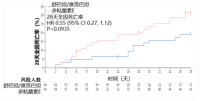 Kaplan-Meier分析显示,从治疗第6天开始,使用舒巴坦/度洛巴坦治疗的患者相比多粘菌素E治疗的患者具有显著更高的生存率。在CRABC m-MITT人群中,第14天的死亡时间风险比为0.32(95% CI 0.10–0.98;p=0.035),第28天的死亡时间风险比为0.55(95% CI 0.27–1.12;p=0.094)。