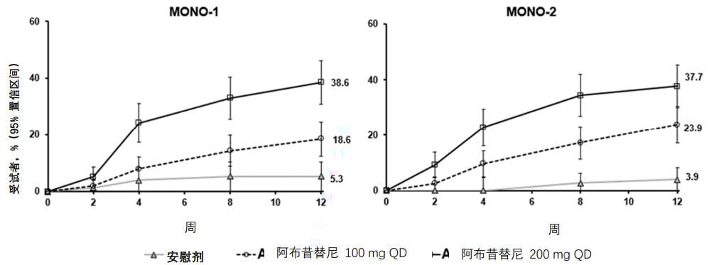 在 MONO-2、COMPARE 和 TEEN 研究中评估了夜间瘙痒量表严重程度(NTIS 严重程度),该 量表是一个使用 0 至 10 分数字评估量表的单项自我报告工具,评分越高表明夜间瘙痒严重程度越高。 两个阿布昔替尼剂量组,在第 2 周时 NTIS 严重程度较基线改善≥4 分的应答者比例均高于安慰剂组, 并维持至第 12 周。在 MONO-2 和 COMPARE 研究中,两个阿布昔替尼剂量组首次达到 NTIS 严重程 度应答的中位时间均短于安慰剂组。