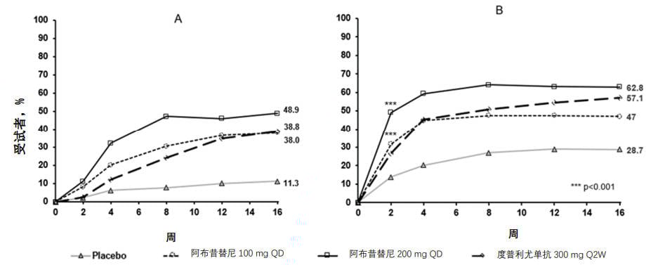 | 安慰剂 | 阿布昔替尼 100mg QD | 阿布昔替尼 200mg QD | 安慰剂 | 阿布昔替尼 100mg QD | 阿布昔替尼 200mg QD | |