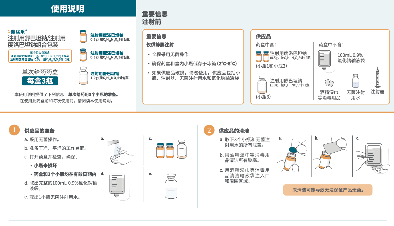 本品为一种组合包装药盒,含 1.0 g 舒巴坦(无菌粉末)的一个透明单剂量小瓶和每瓶含 0.5 g 度洛巴坦(无菌粉末)的两个棕色单剂量小瓶,静脉输注前须使用无菌操 作进行复溶和进一步稀释。本品不含抑菌防腐剂,已稀释的输注溶液,如果不立即使用,需要在2-8℃的冷藏条件下储存(不得冷冻),并在使用前置于室温下复温(15-30分钟)。每次静脉输注时间持续3小时,且从粉末溶解开始至输注结束的时间不得超过24小时。未用完药液应丢弃。